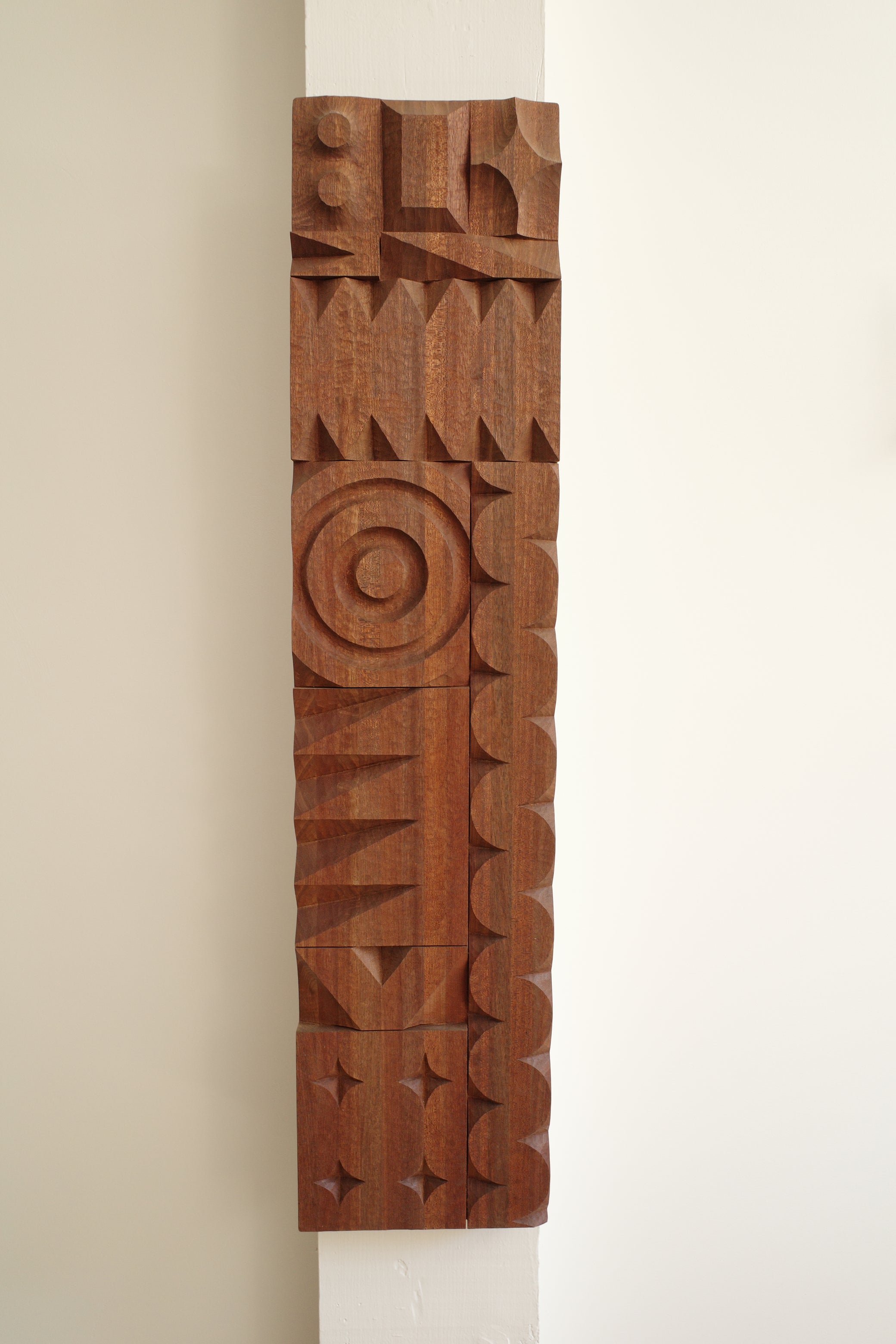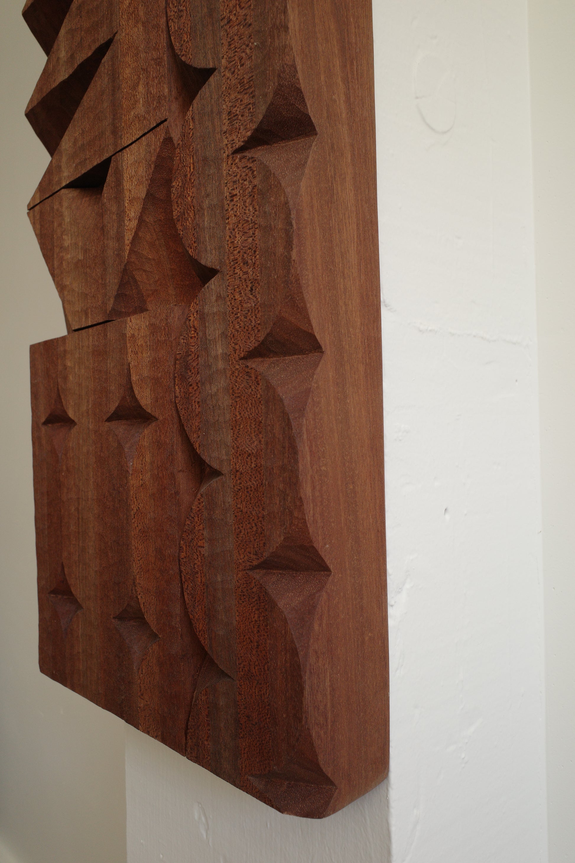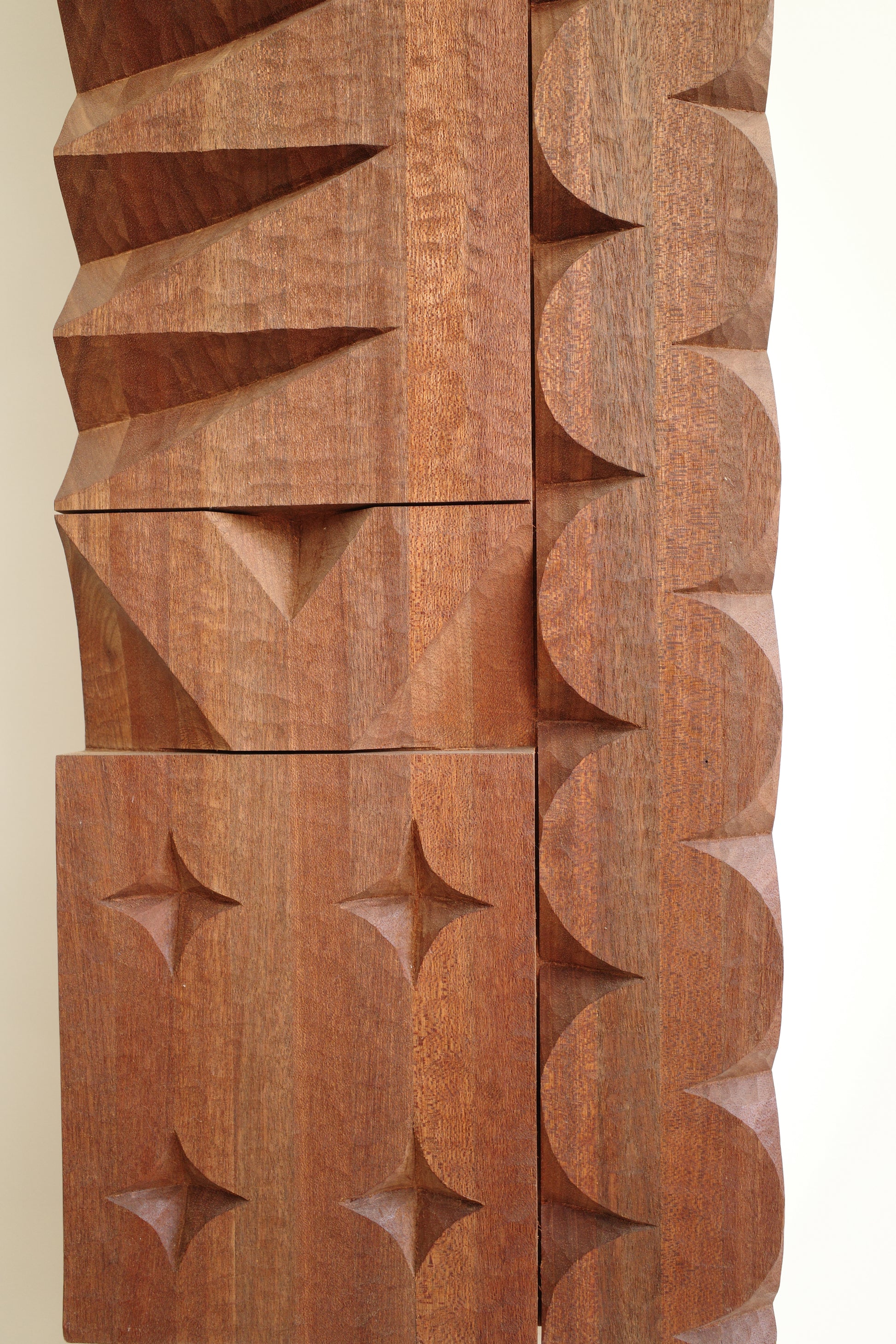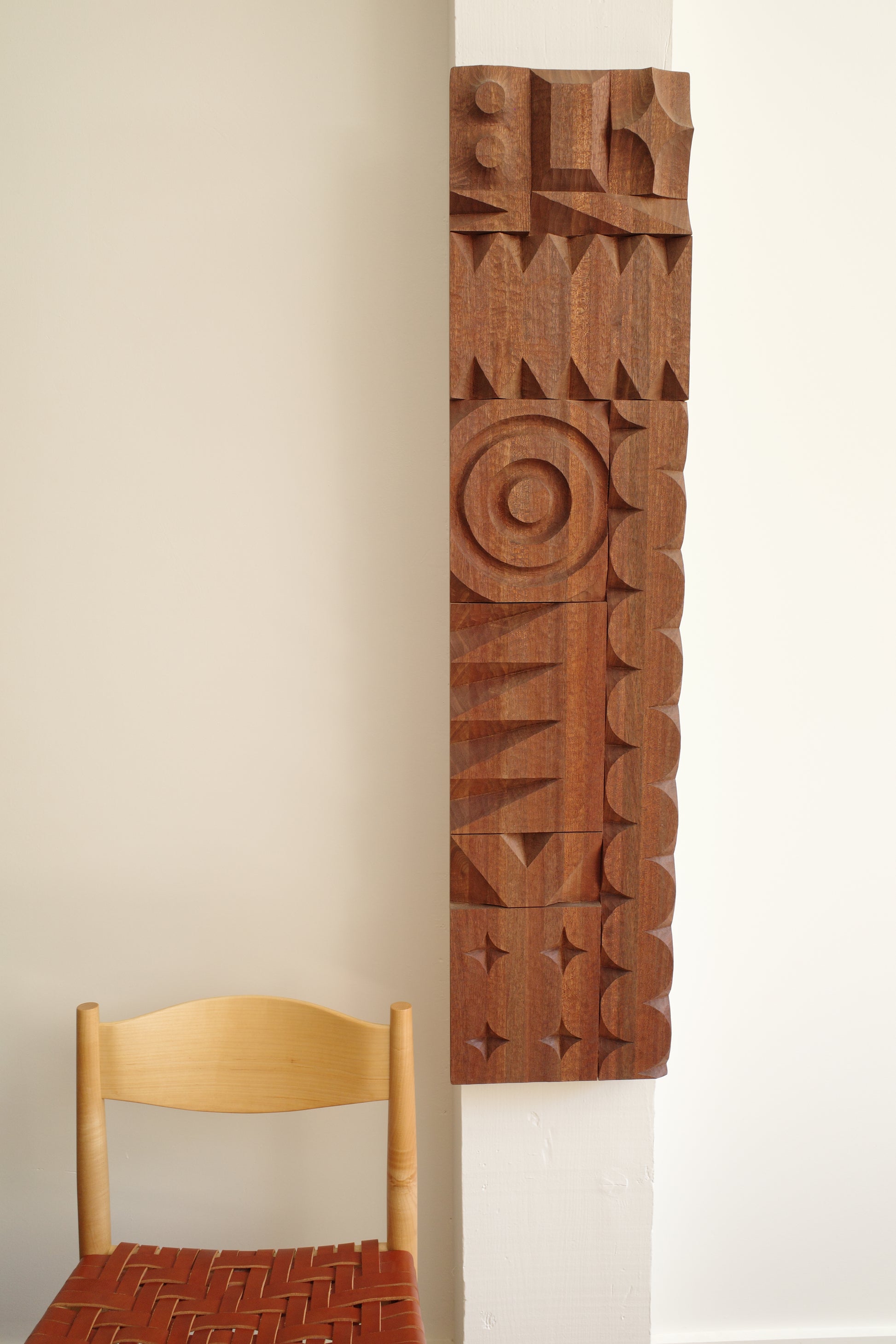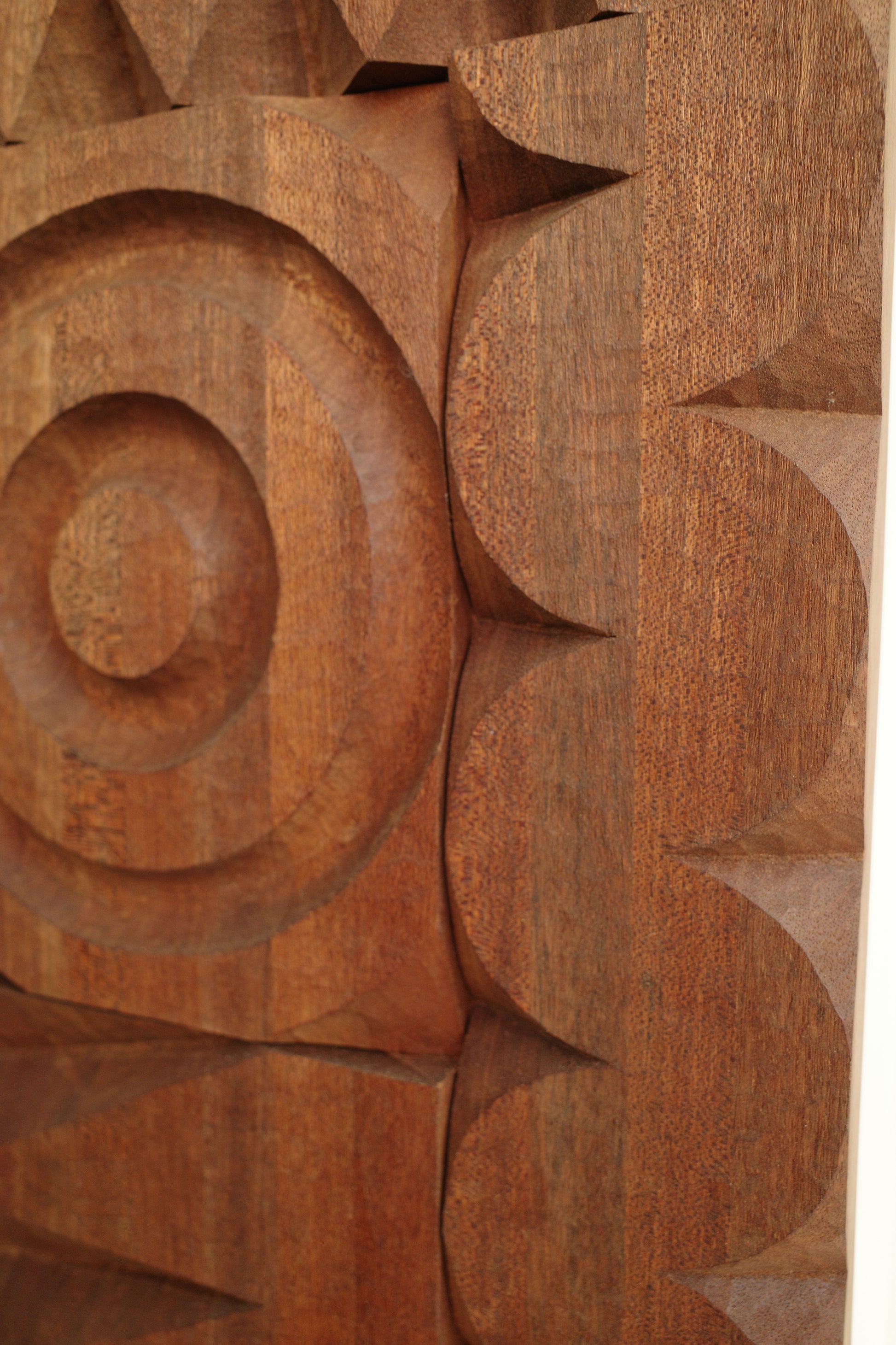 One of a kind relief carving by artist Adam Zeek. A lamination of Meranti wood, sized and carved in Zeek's distinctive graphic shape style. This piece was carved by Adam with minimal power tools, mostly hand tools, and maximum feeling.