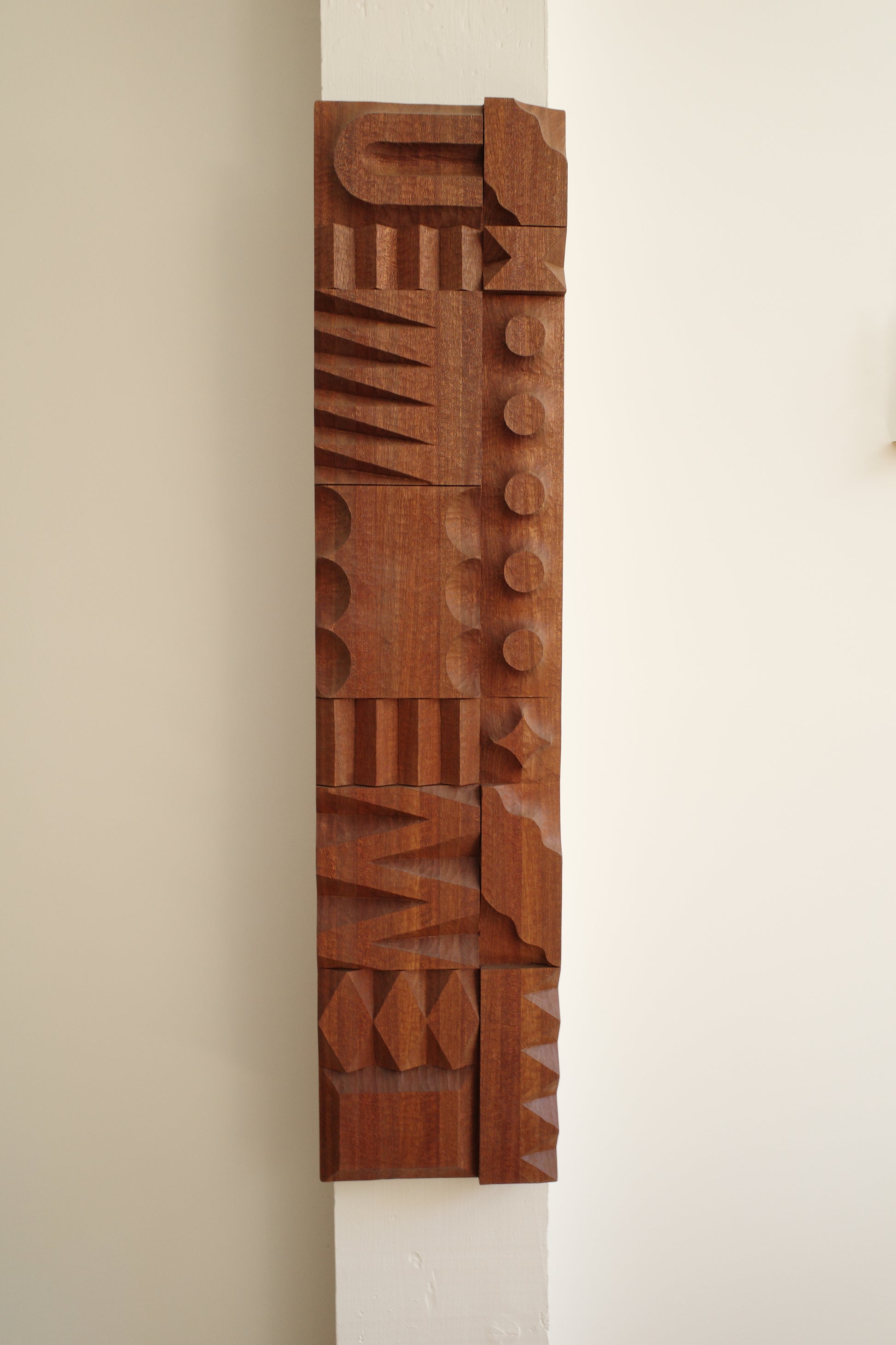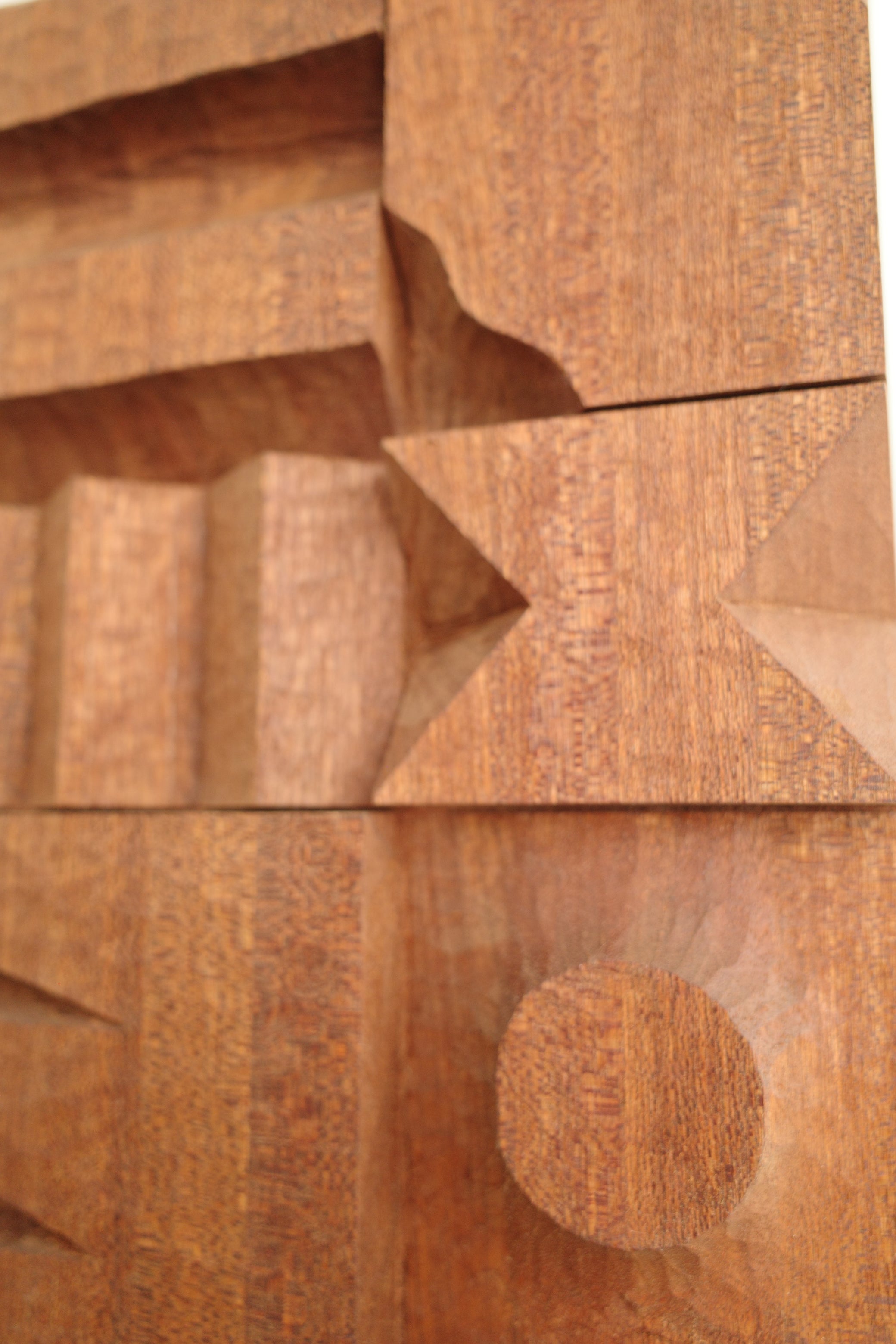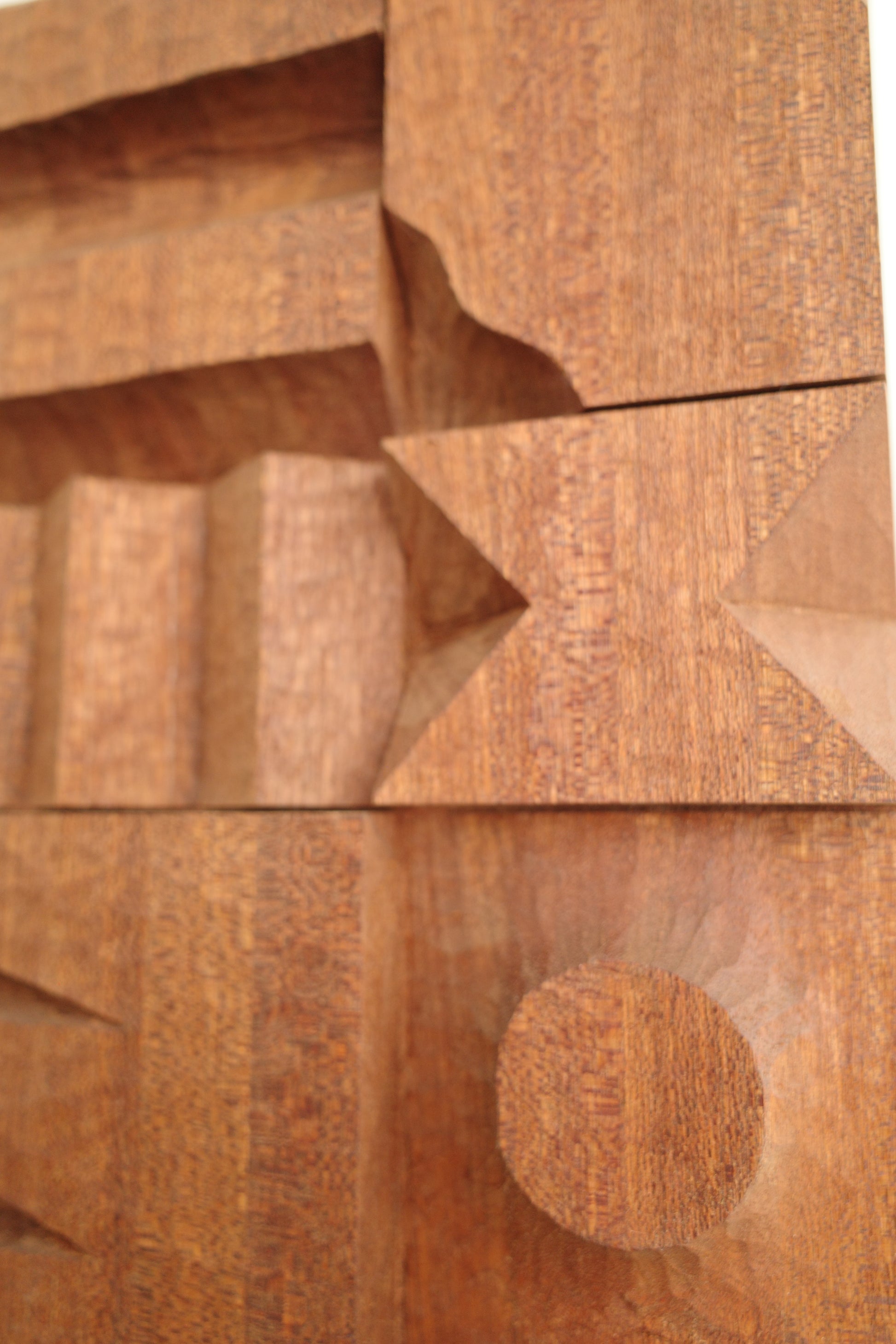 One of a kind relief carving by artist Adam Zeek. A lamination of Meranti wood, sized and carved in Zeek's distinctive graphic shape style. This piece was carved by Adam with minimal power tools, mostly hand tools, and maximum feeling.