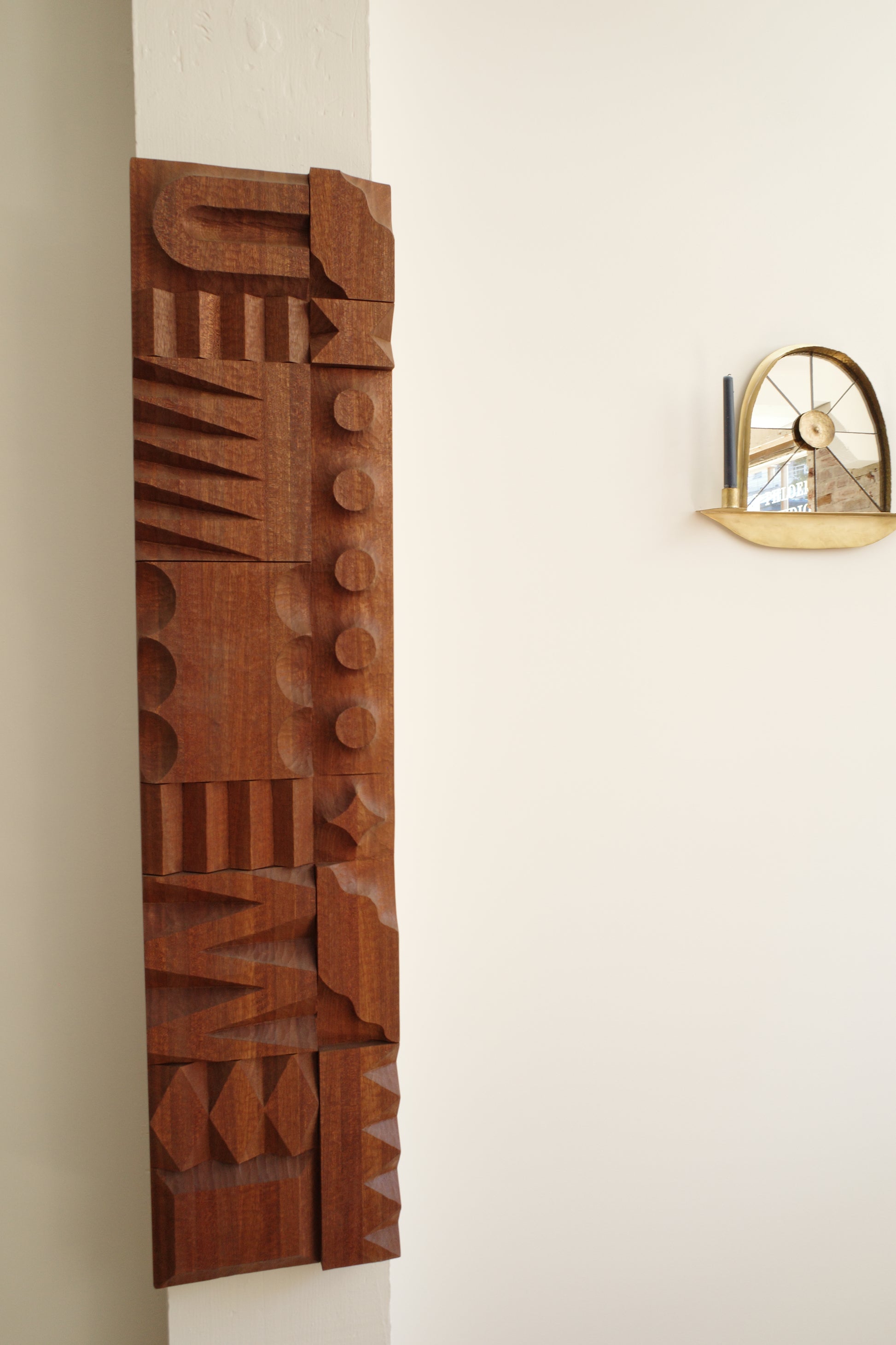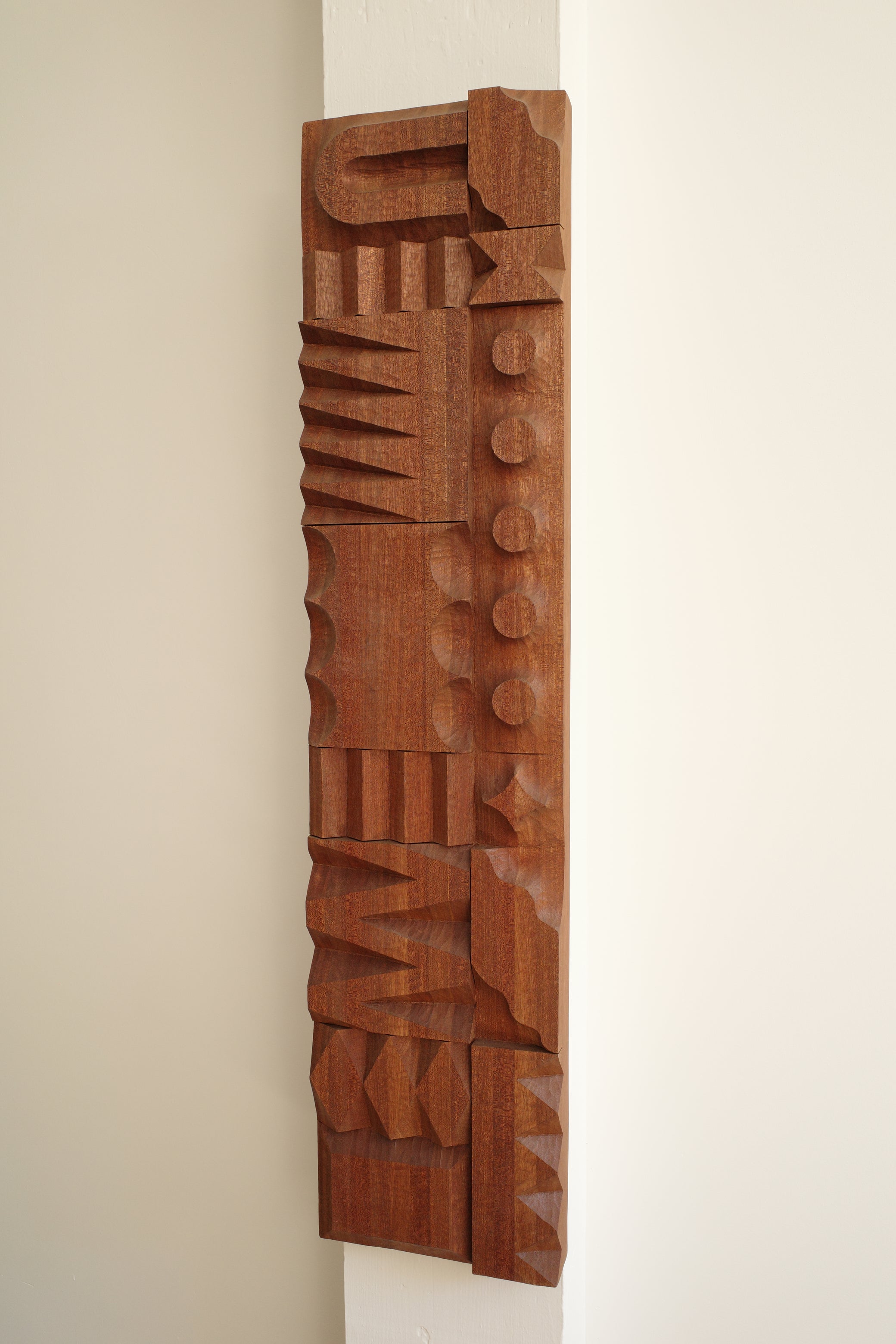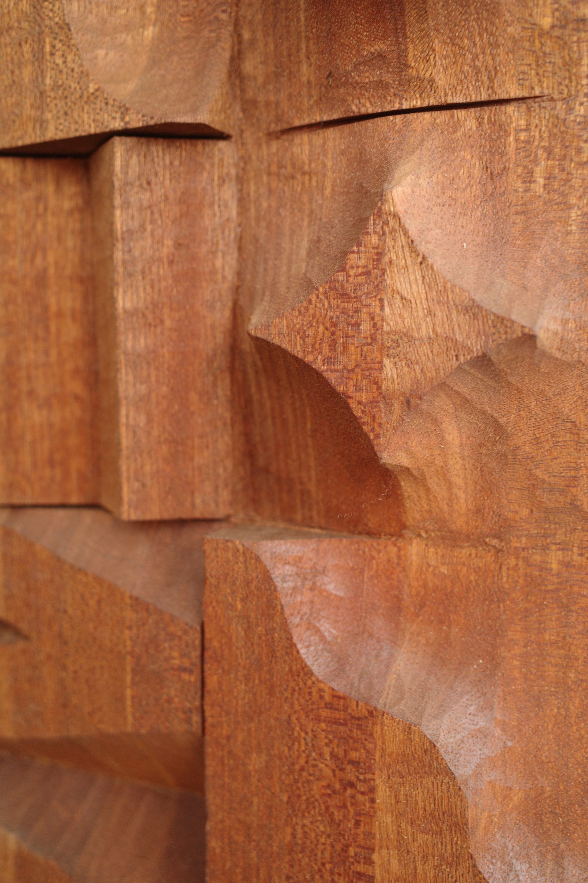 One of a kind relief carving by artist Adam Zeek. A lamination of Meranti wood, sized and carved in Zeek's distinctive graphic shape style. This piece was carved by Adam with minimal power tools, mostly hand tools, and maximum feeling.