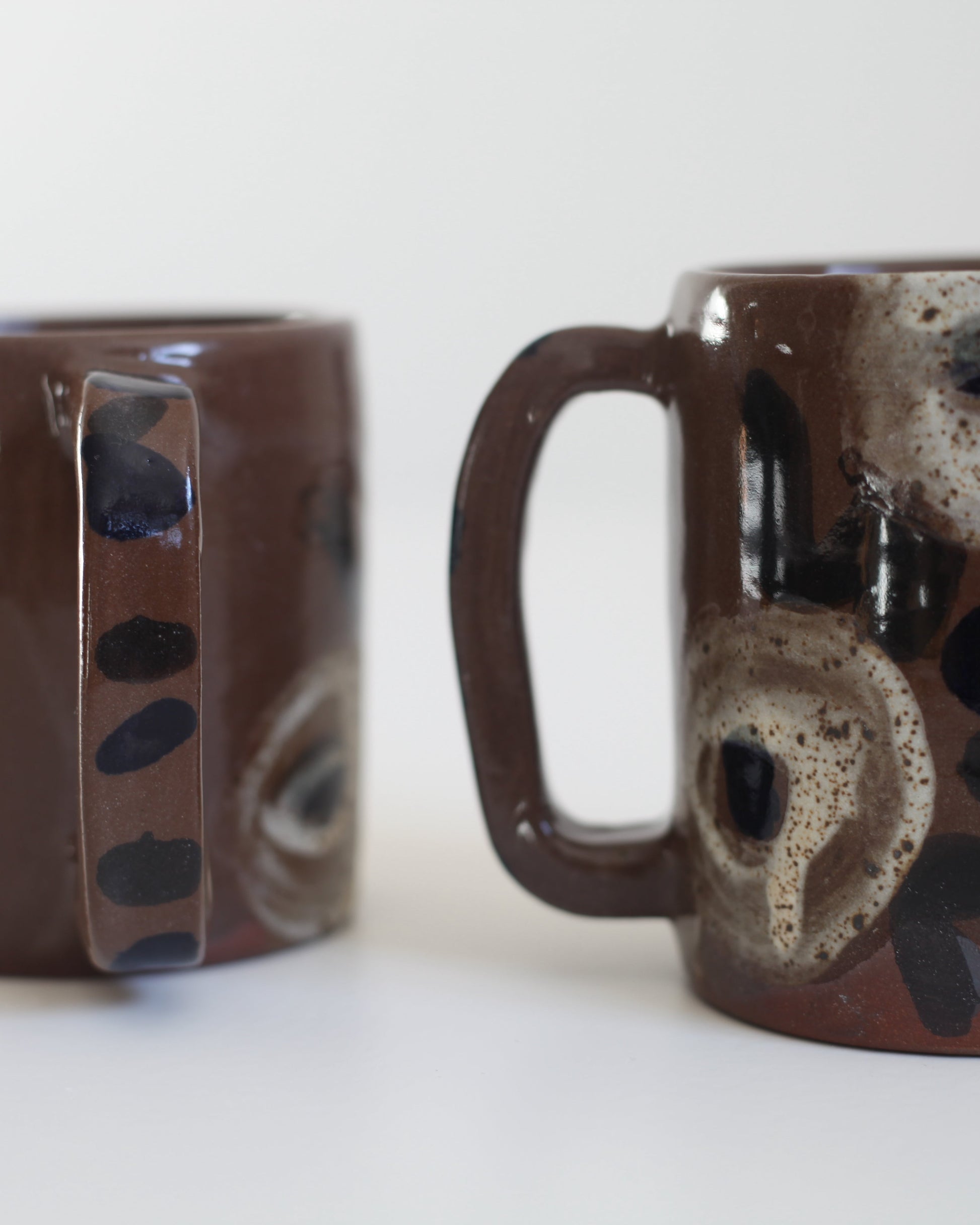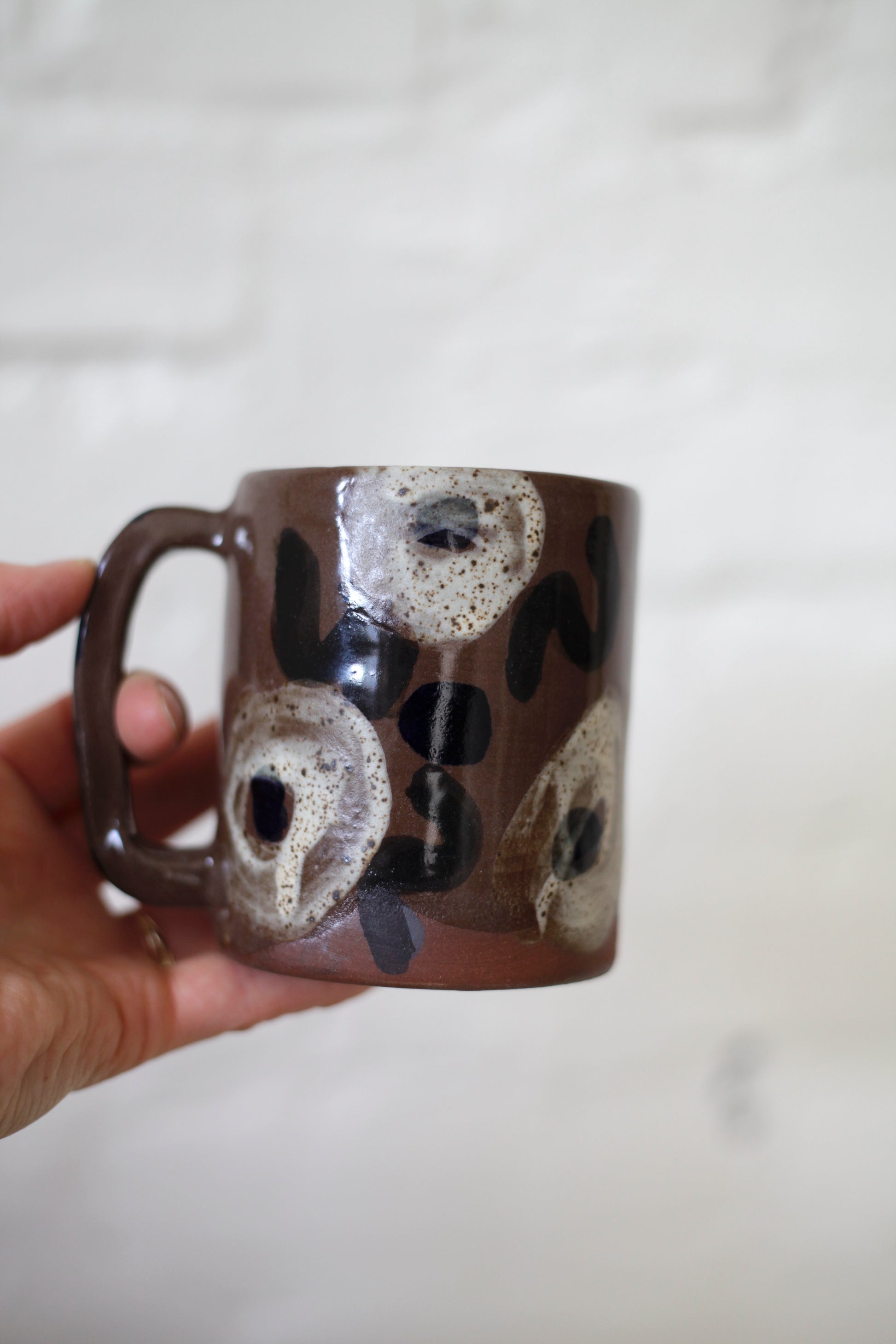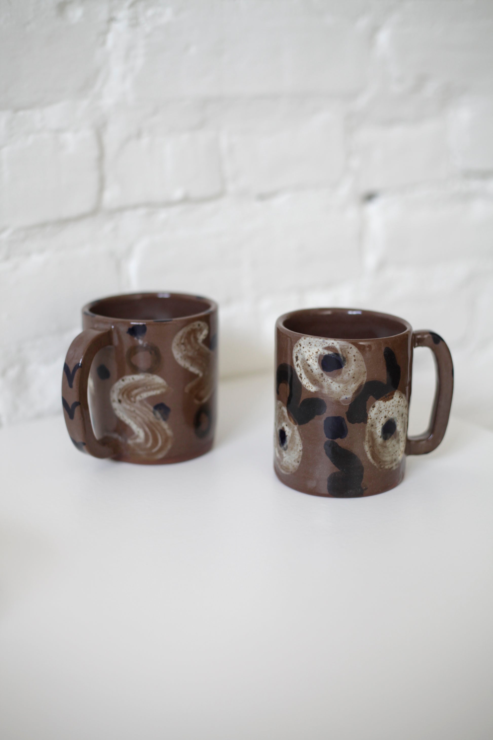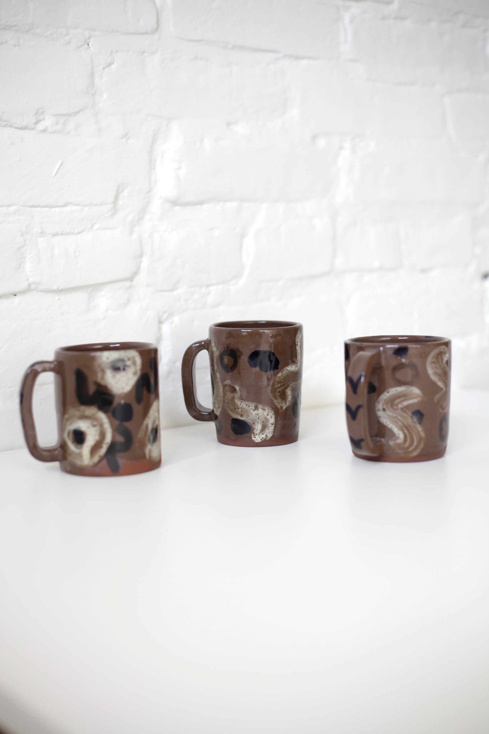 Hand formed earthenware mug with hand painted charcoal, navy, and cream patterns. Each mug is one of a kind. Holds about 12 ounces. Expect subtle variations in size and shape.