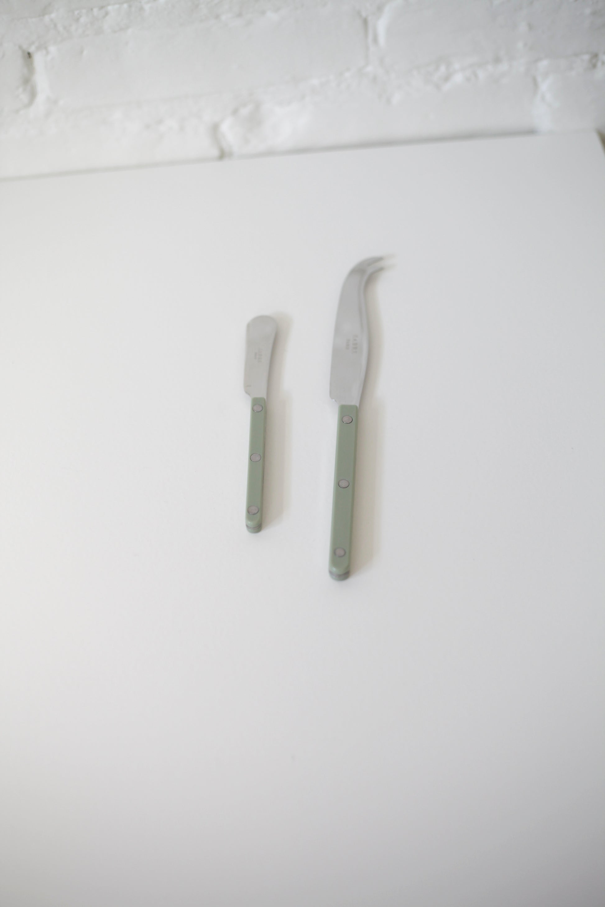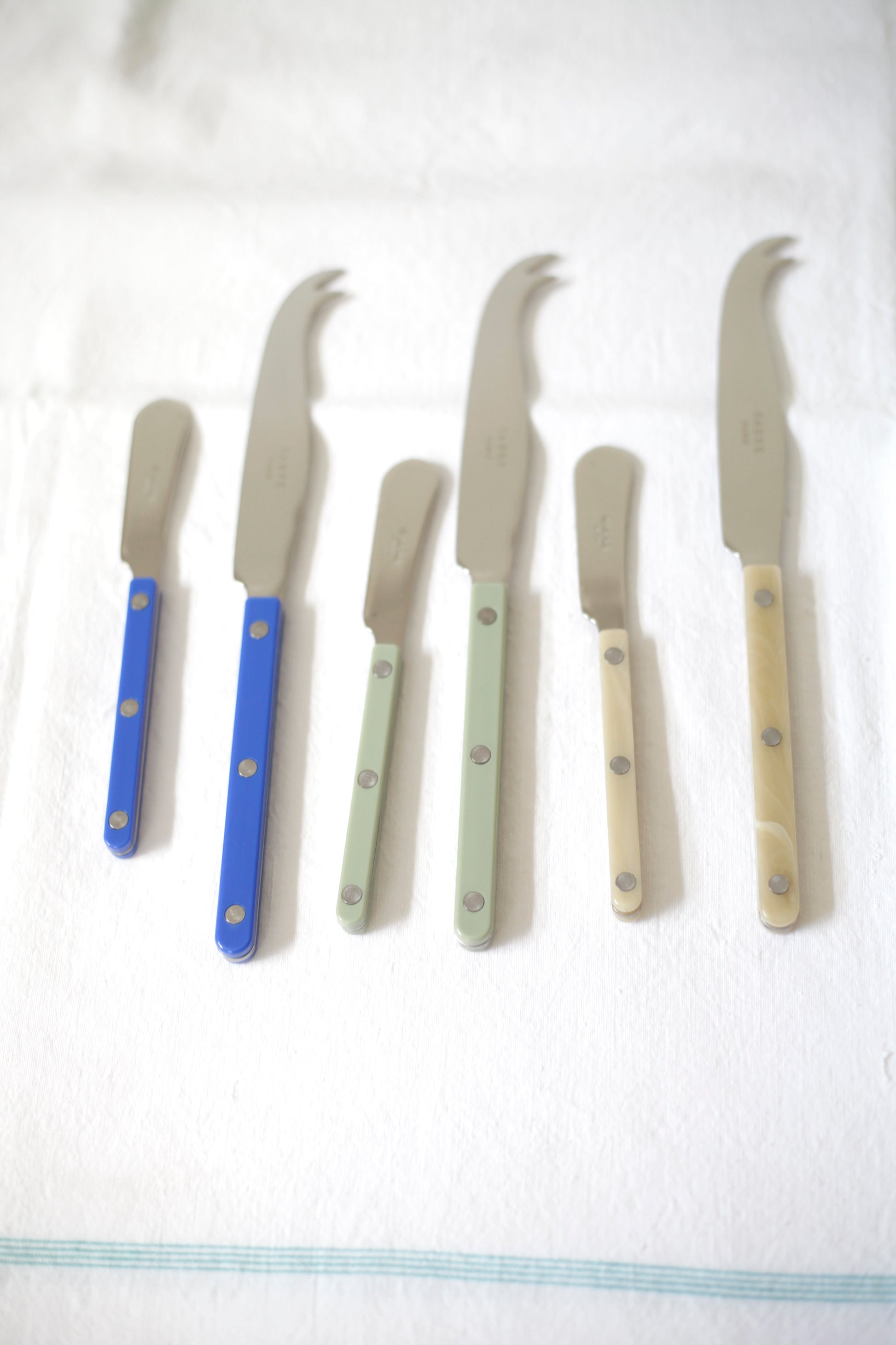 Set of cheese knife and spreader. Inspired by classic french bistro ware. Stainless steel blade and rivets, acrylic handle. Dishwasher safe. Do not use abrasive scrubbers on acrylic.