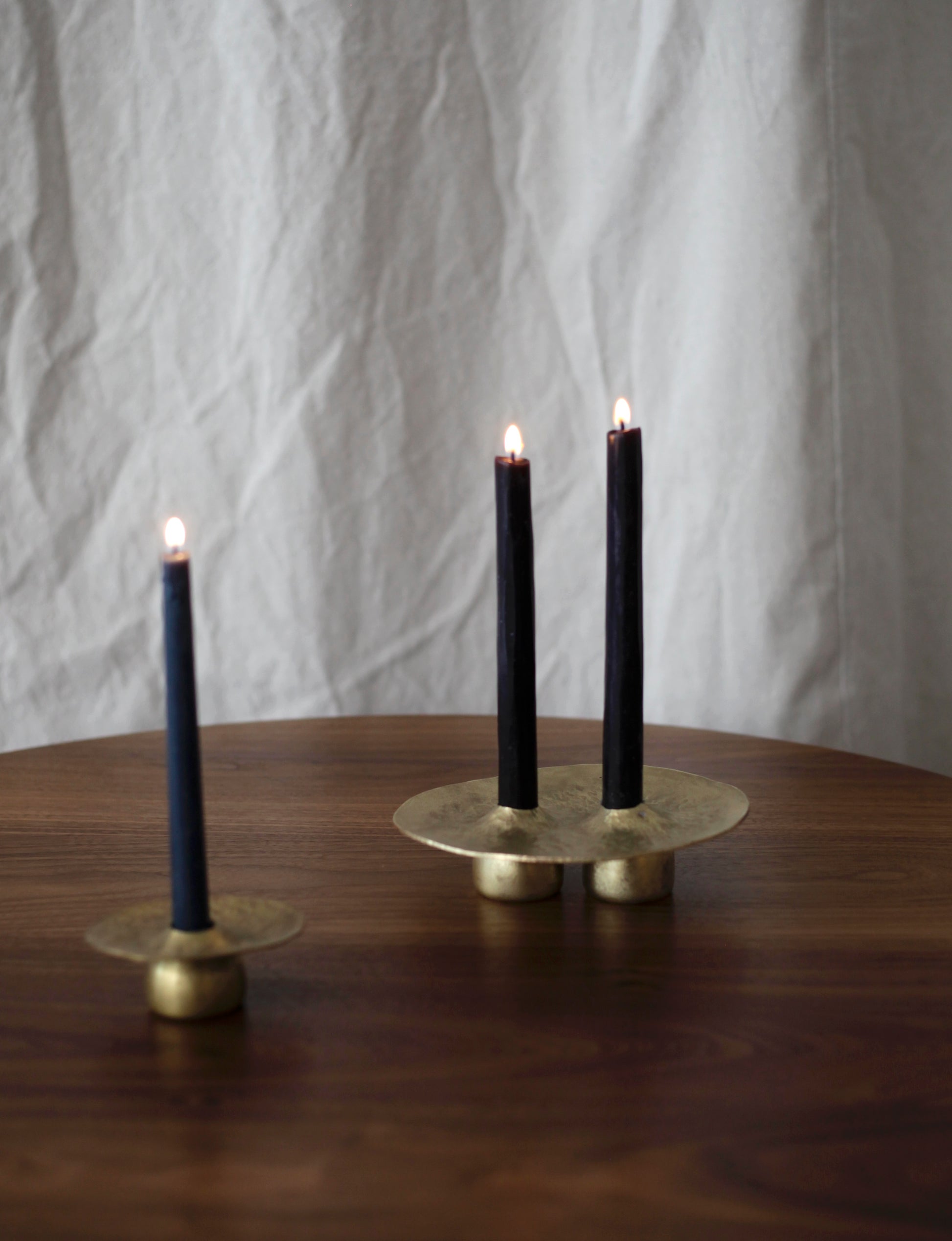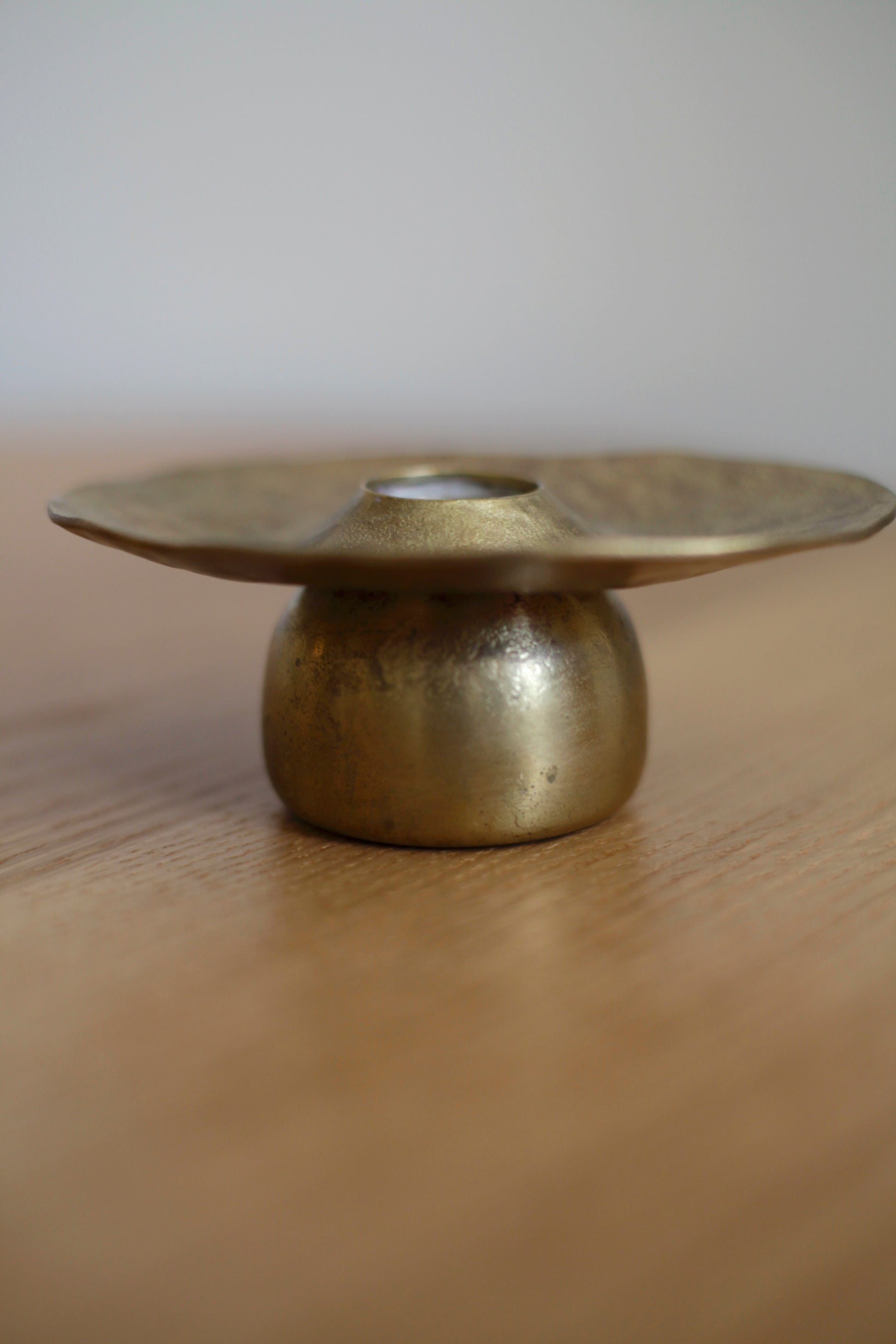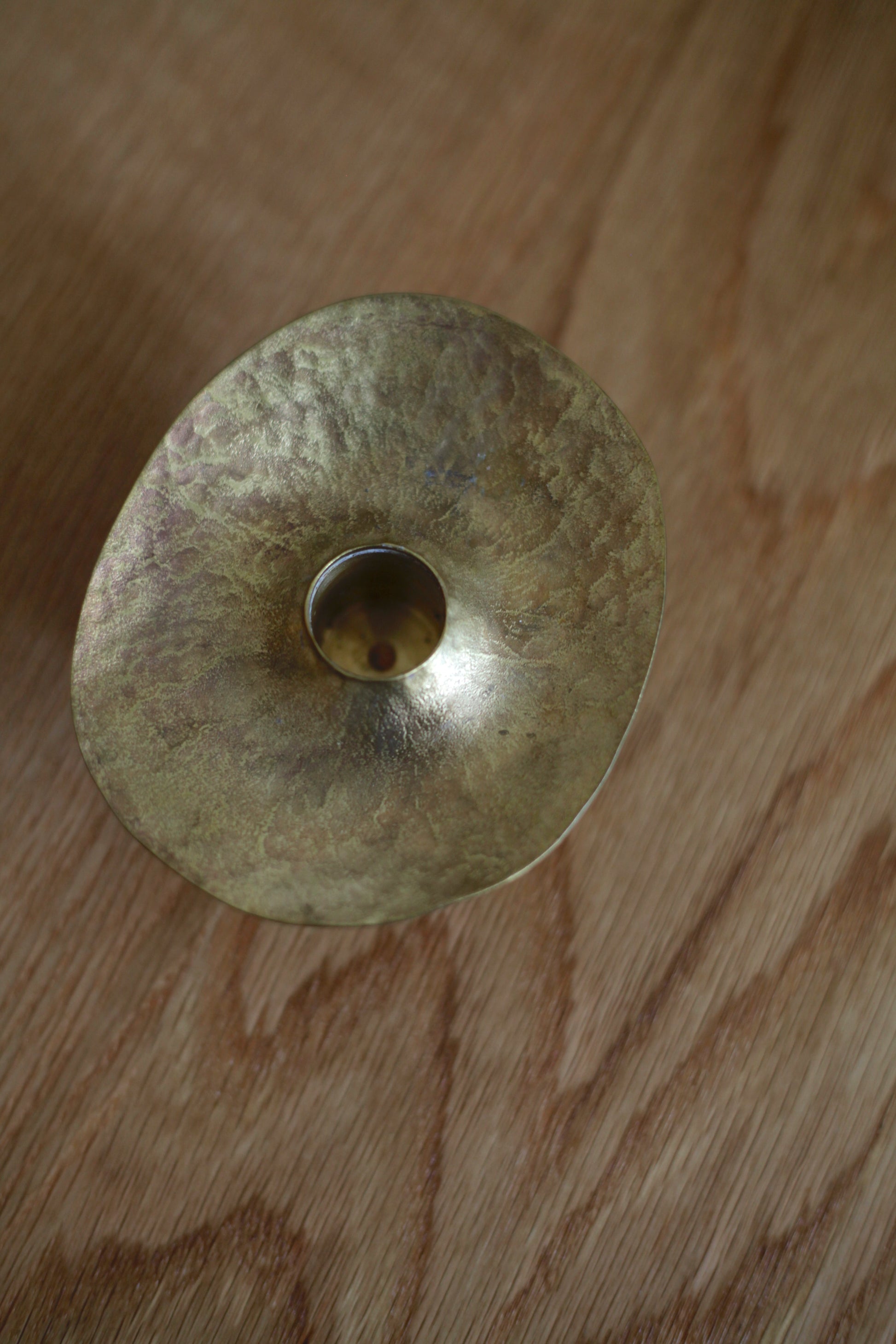 A weighty and textural shape that holds light and shadow, this hand turned brass pillow supports a hammered disk that holds a 7/8” candle. Finished with a matte wax, this piece will evolve over time to develop a living patina.