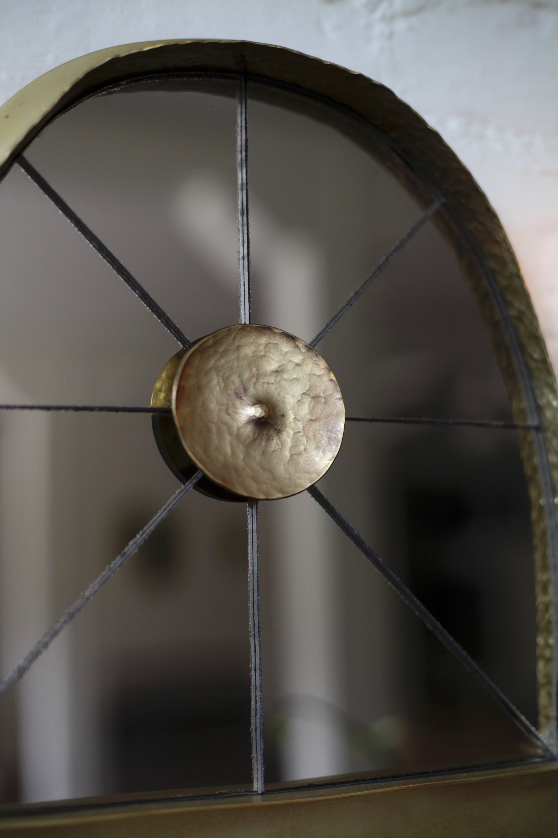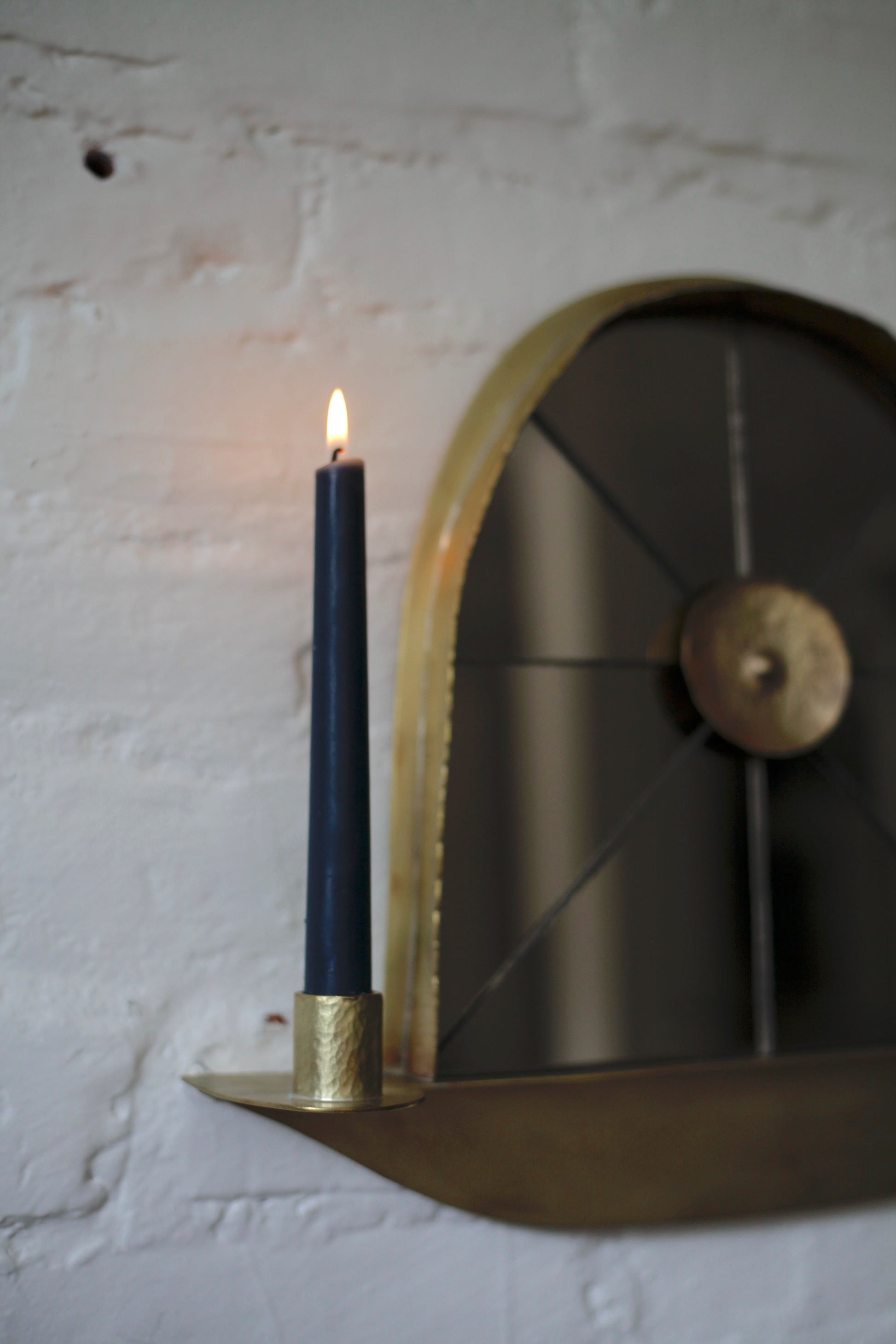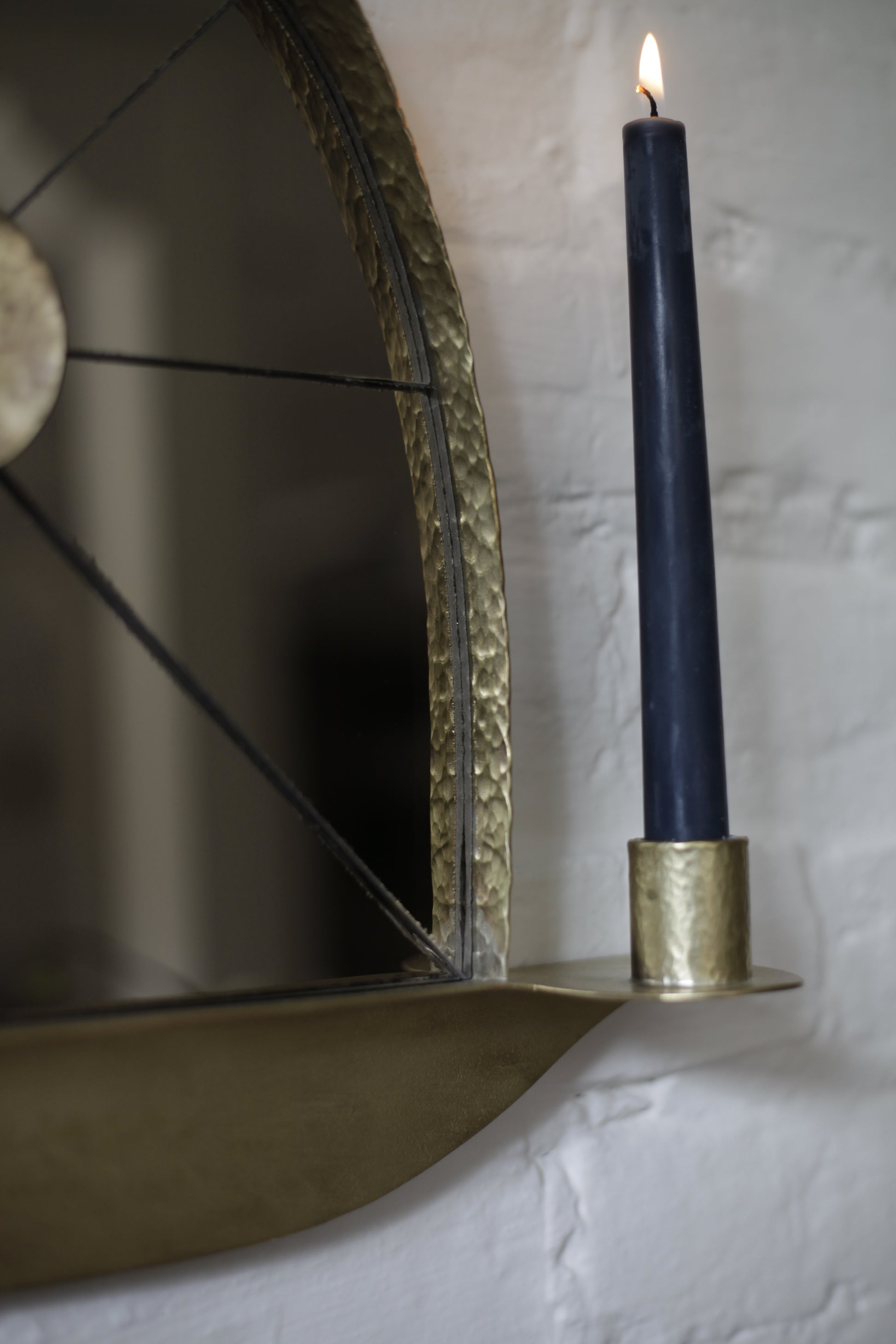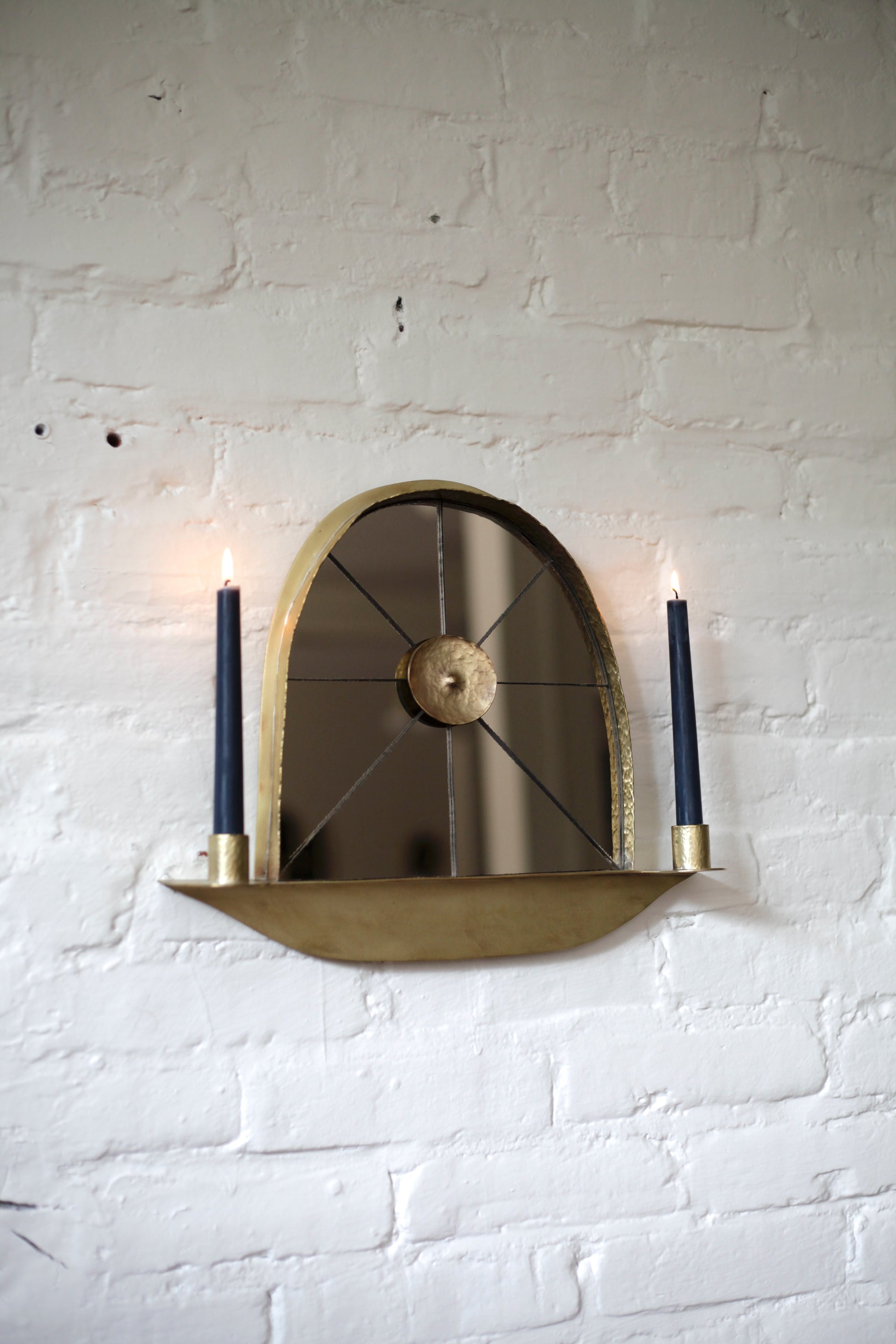 Brass plate is forged, etched, and brazed to envelop a bronze segmented mirror. The frames, candle holders, and sculptural center wheel are all hammered to a satin ripple texture. Finished with matte wax, this piece will evolve over time and continue to develop a living patina. Fits two 7/8” candles and secures to your wall with a brass cleat.