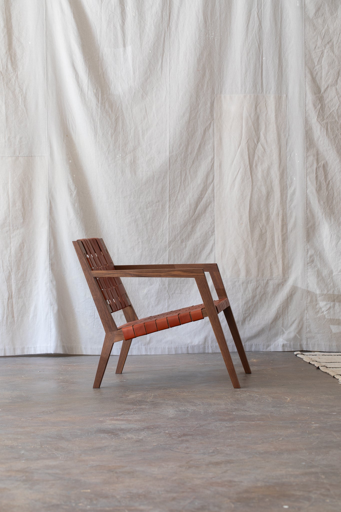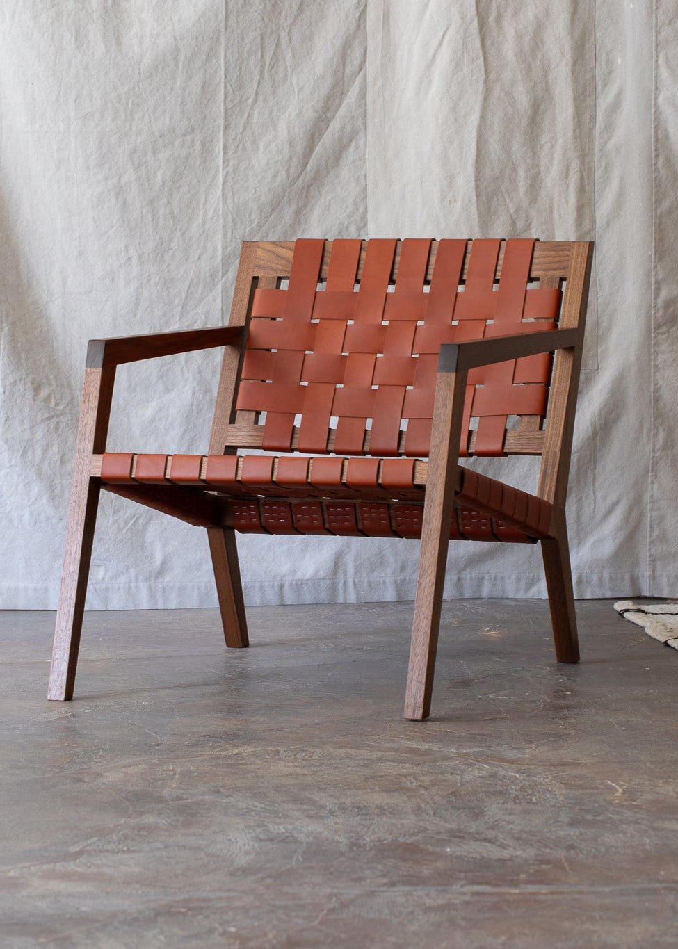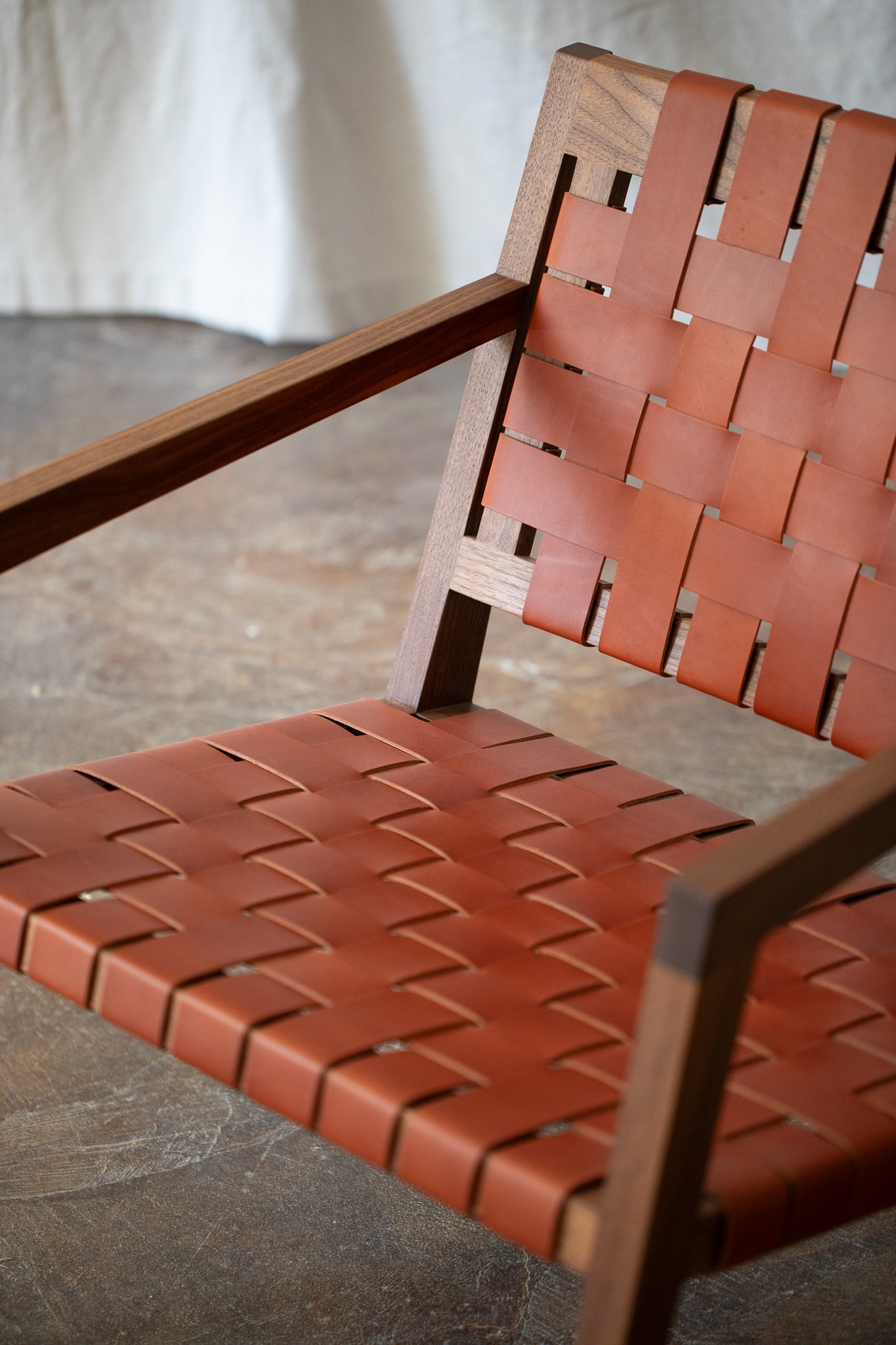 The Nadine Lounge Chair is a contemporary lounge chair with a solid wood frame and a leather strap woven seat. This chair features exposed handcrafted spline joinery and a subtly curved solid wood laminated back. Heavy weight bridle leather straps woven together create a supportive and comfortable recline. Designed by Benjamin and his sister, Jessica Klebba, named after their mom. The Nadine Lounge was inspired by bridge architecture and is the oldest design in the PHLOEM collection.