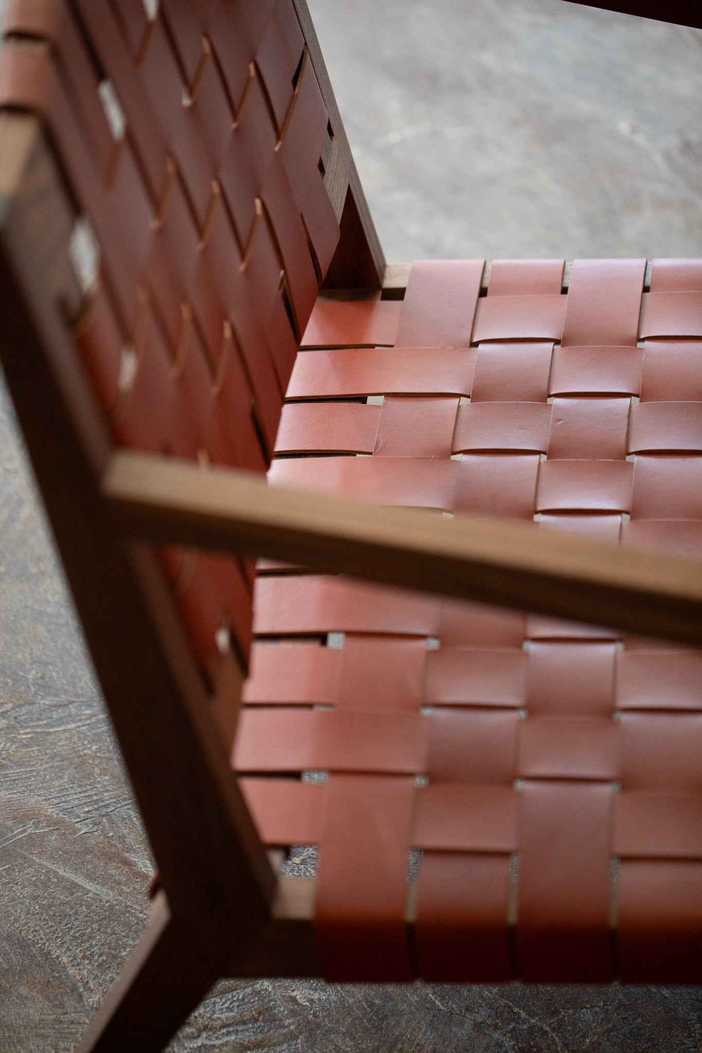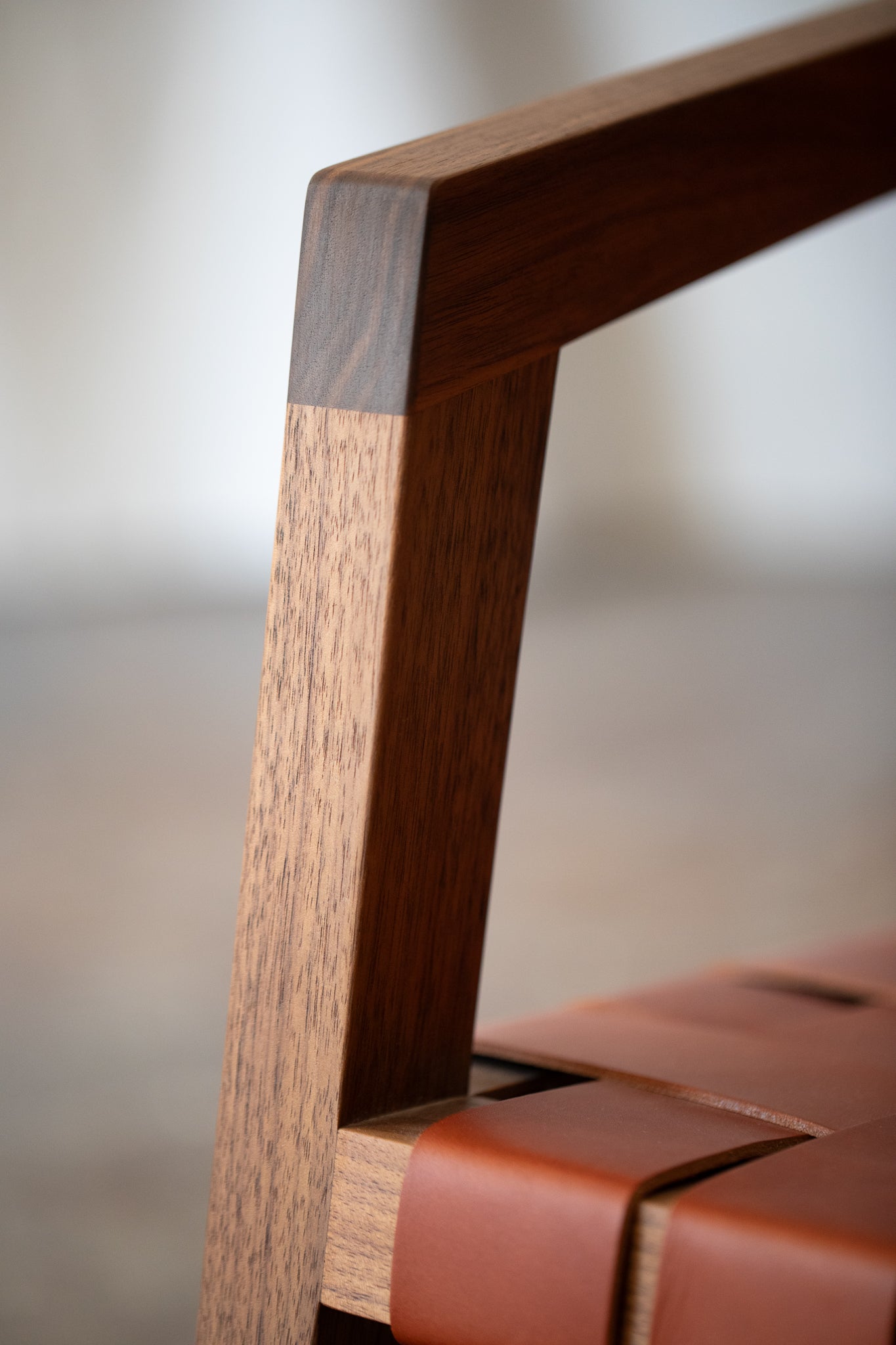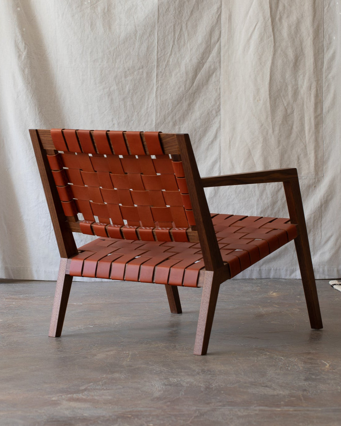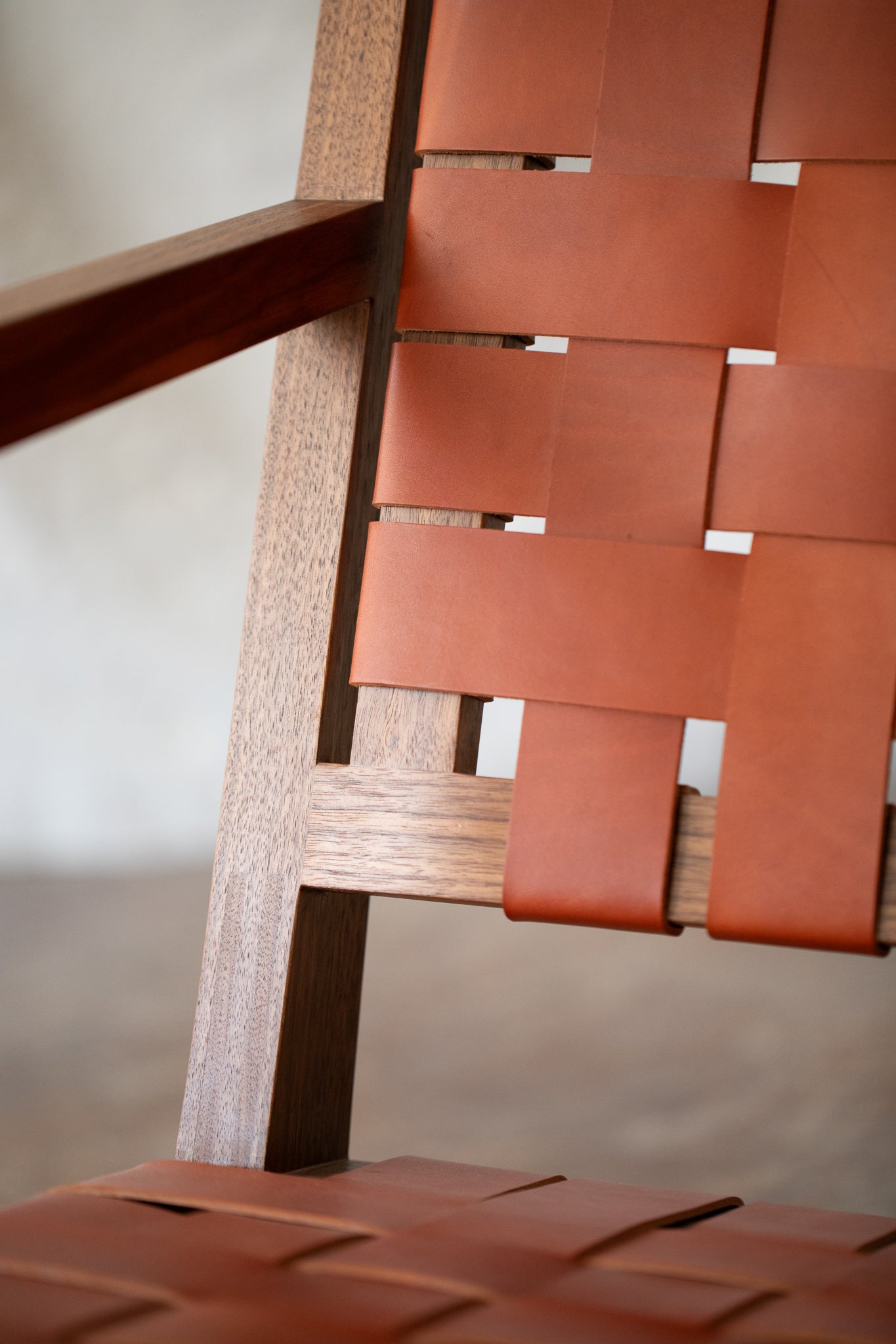 The Nadine Lounge Chair is a contemporary lounge chair with a solid wood frame and a leather strap woven seat. This chair features exposed handcrafted spline joinery and a subtly curved solid wood laminated back. Heavy weight bridle leather straps woven together create a supportive and comfortable recline. Designed by Benjamin and his sister, Jessica Klebba, named after their mom. The Nadine Lounge was inspired by bridge architecture and is the oldest design in the PHLOEM collection.