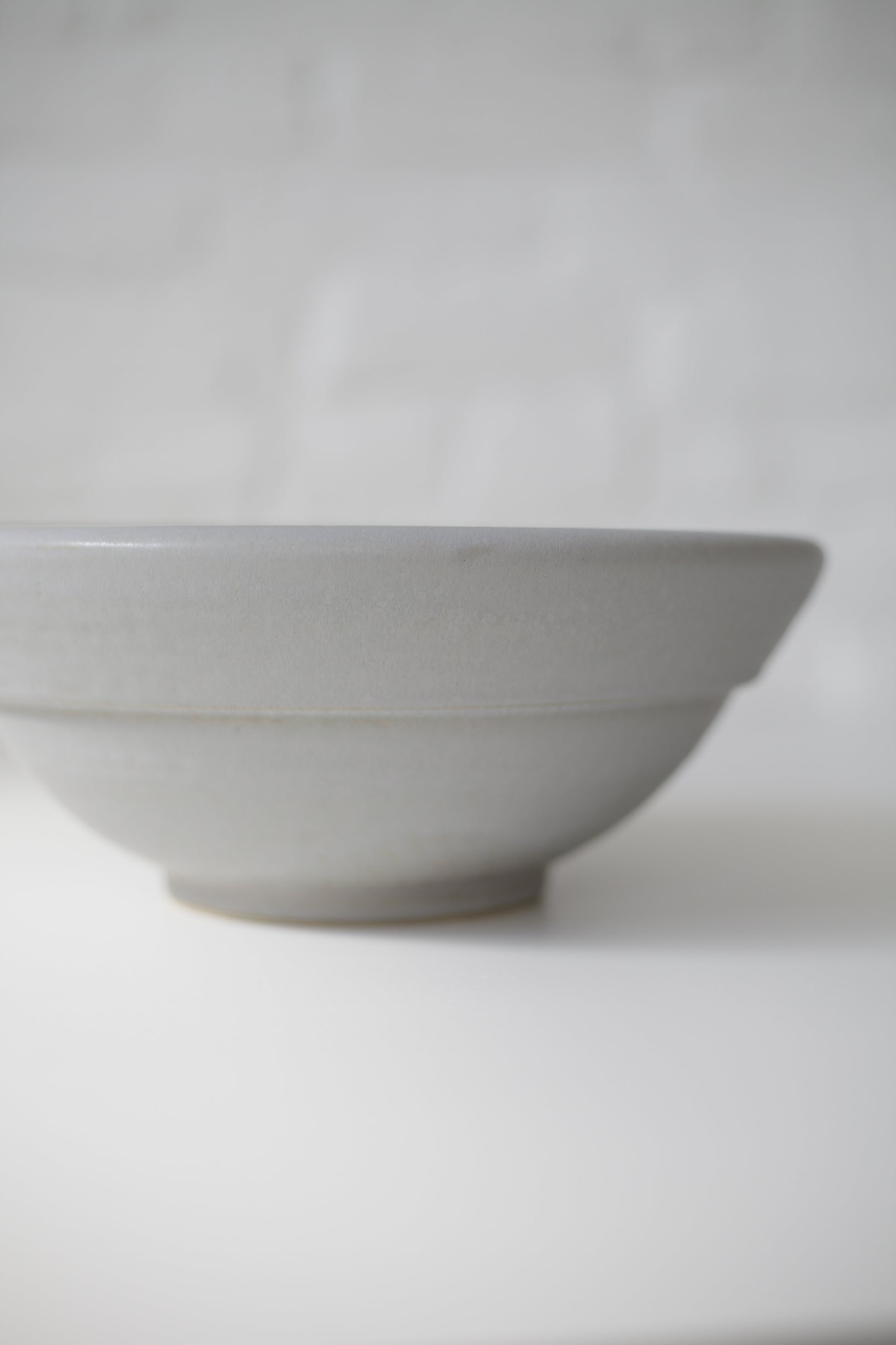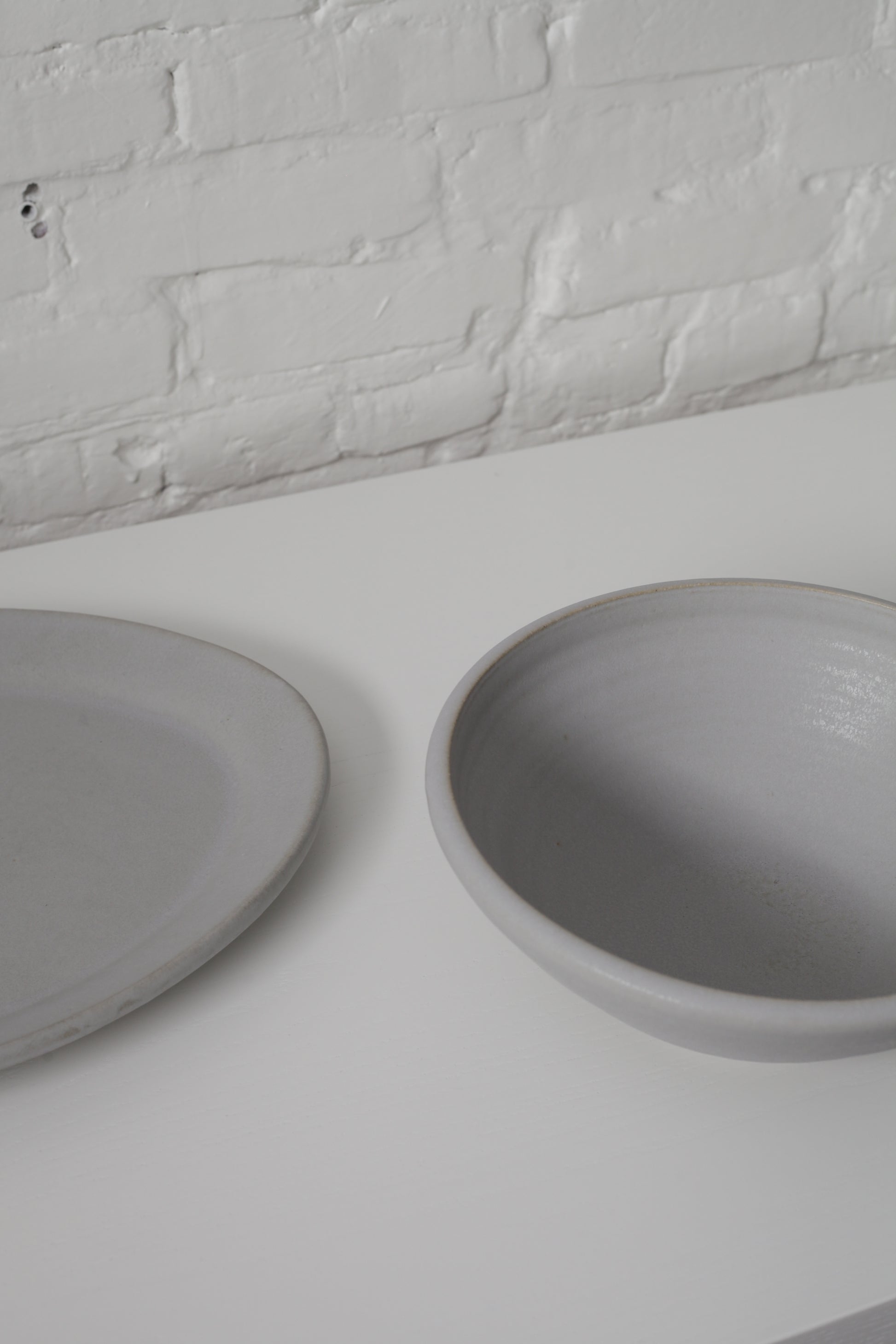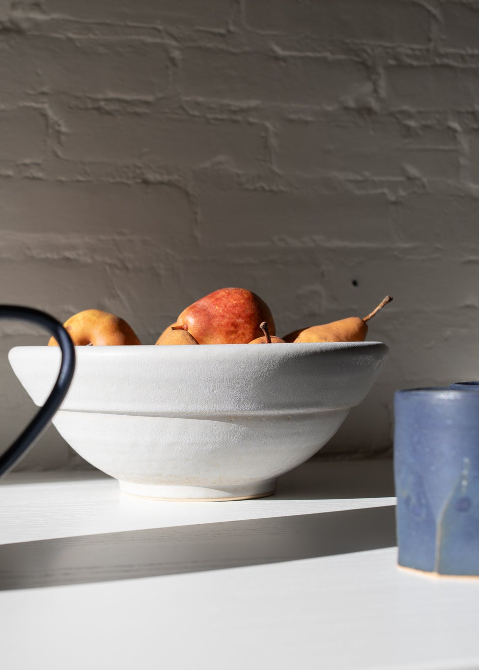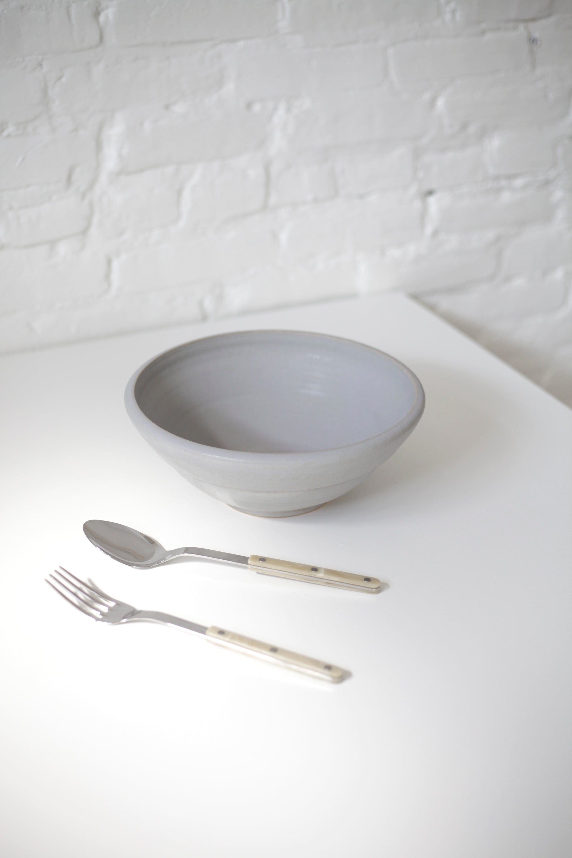 An elegant and weighty hand thrown large format bowl for serving, kitchen prep, or counter display. Semi-matte, eggshell glaze in Stone grey that shows texture and handmade character. Made in Los Angeles by Sheldon Ceramics.